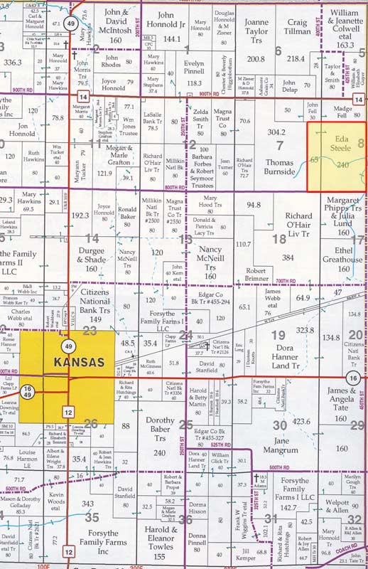 Legal Description: The southwest quarter and south half of the northwest quarter in Section 8, TWN 13N, R13W and the east 65 acres of even width of the southeast quarter and the southeast quarter of the northeast quarter in Section 7, TWN 13, R13W of the 2nd P.M., Edgar Co., IL, containing 305 acres more or less.