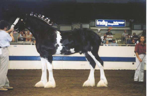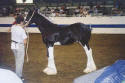 Horses for sale Click on the pictures below for larger photos. Wolf Mound’s January Jett #20359, DOB 1/29/02 – A black yearling stud colt that has a lot of excellent “black” breeding behind him. He is sired by Armageddon’s Lord Caleb and out of a Wolf Mound’s Model Lady daughter, Wolf Mound’s Determination. Jett placed 2nd out of 14 in the yearling stud class at the Mid-America Clydesdale Show at the Indiana State Fair held in August of 2003. He has a lot of "chrome" to go along with his hitch horse attitude. Jett will be an excellent sire prospect and an even greater hitch horse prospect. Price: $10,000 Wolf Mound's Jackson #20793, DOB 1/24/03 - Jack is stud colt with a wealth of breeding behind him. He is sired by Armageddon's Lord Caleb and out of a Wolf Mound's Model Lady daughter, Wolf Mound's Destiny (E.T.). He is three-quarters a brother to Wolf Mound's January Jett, who is pictured above. Jack placed 3rd out of 19 stud colt weanlings at the Mid-America Clydesdale Show at the Indiana State Fair held in August of 2003. For a young horse, Jack is extremely easy to work around and be handled. With his genetic breeding, Jack has the potential for being a top quality stallion. If you are looking towards the future in breeding "black Clydesdales", then look at Jack, because he will lead you there. Price: $6,000- SOLD Blackgate Eclipse #18905, DOB 4/11/99 - A 4 year old “jett black” gelding with four legs and a white blaze. He is broke to drive single and double and also to ride under western saddle. He is an extremely easy horse to work around. He stands great in cross ties for grooming, clipping, washing, the farrier, etc. Eclipse is a clean legged and has a great foot. Picture was taken in July of 2003. Price: $6,000- SOLD Wolf Mound’s Express Diamond #19143, DOB 1/19/2000. Diamond is consigned to the 2003 National Clydesdale Sale that is held in Springfield, IL on April 26. She is a three-year-old black mare with lots of good breeding behind her. Sired by the western Canadian horse Donegal Midnight Express and out of a Wolf Mound’s Model Lady daughter, Wolf Mound’s Lady Dutchess. Diamond will be bred to Armageddon’s Lord Caleb, a black stallion sired by Northwest Glenords Shea and out of the Broadlea Classic Perfection mare, for an early 2004 foal. She has a great foot to go with her clean legs. Extremely easy mare to work with and handle. If you like "Black Clydes" then let Diamond help your breeding program. Diamond was sold after the Clydesdale sale. Price: $8,000- SOLD Wolf Mound’s Glenord Glenna #14704, DOB 4/9/1991-She is a tall, clean legged mare that has proven herself as a great brood mare. In the last three seasons Glenna has foaled three Green leaf Prestige daughters. Glenna is open for 2003, but she will be bred to Armageddon’s Lord Caleb, a son of Northwest Glenords Shea, before the Sale for an early 2004 foal. If you like quality breeding, then look at Glenna’s pedigree and names that stand out like Bardrill Glenord and Silver Perfection Fleming. She is a half-sister to our well know mare, Wolf Mound’s Model Lady. Let Glenna give your breeding program a boost. Glenna was sold at the Clydesdale Sale for $5,200. Wolf Mound’s Heather #19723 – A 2 year old bay filly that is sired by the 1999 All-American Stallion Green Leaf Prestige and out of Wolf Mound’s Glenord Glena. Heather is a good sized filly with allot of potential for the future. Picture was taken in August of 2002. Price: $6,000 - SOLD Wolf Mound’s Dutchess-5 year Black show mare. Broke single and double, has been used in ladies cart class. In foal to Armageddon’s Lord Caleb for early 2002. Extremely easy to handle mare. Price: $8,500 -