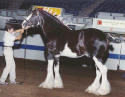 Caleb is sired by the great Northwest Glenords Shea and out of the well known Classic Wallace mare Broadlea Classic Perfection. Caleb won the Futurity Cart Class at the 1998 National Clydesdale Show as a 2 year-old. He sired the 1st place filly foal at the 2000 Great Lakes International Show. He has also sired two stud colts on our farm, one being Wolf Mound’s January Jett, who qualified for All-American in 2002 and 2003 and the other being Wolf Mound’s Jackson, who qualified for All-American in 2003. Caleb is truly a "gentle" stallion that loves to wear the harness. Until now he has not received the chance to strongly prove himself. If you need some "color" with a pedigree behind it and feather "to burn" in your breeding program then give Caleb a try. Caleb offers a unique cross to Clydesdale mares of today.